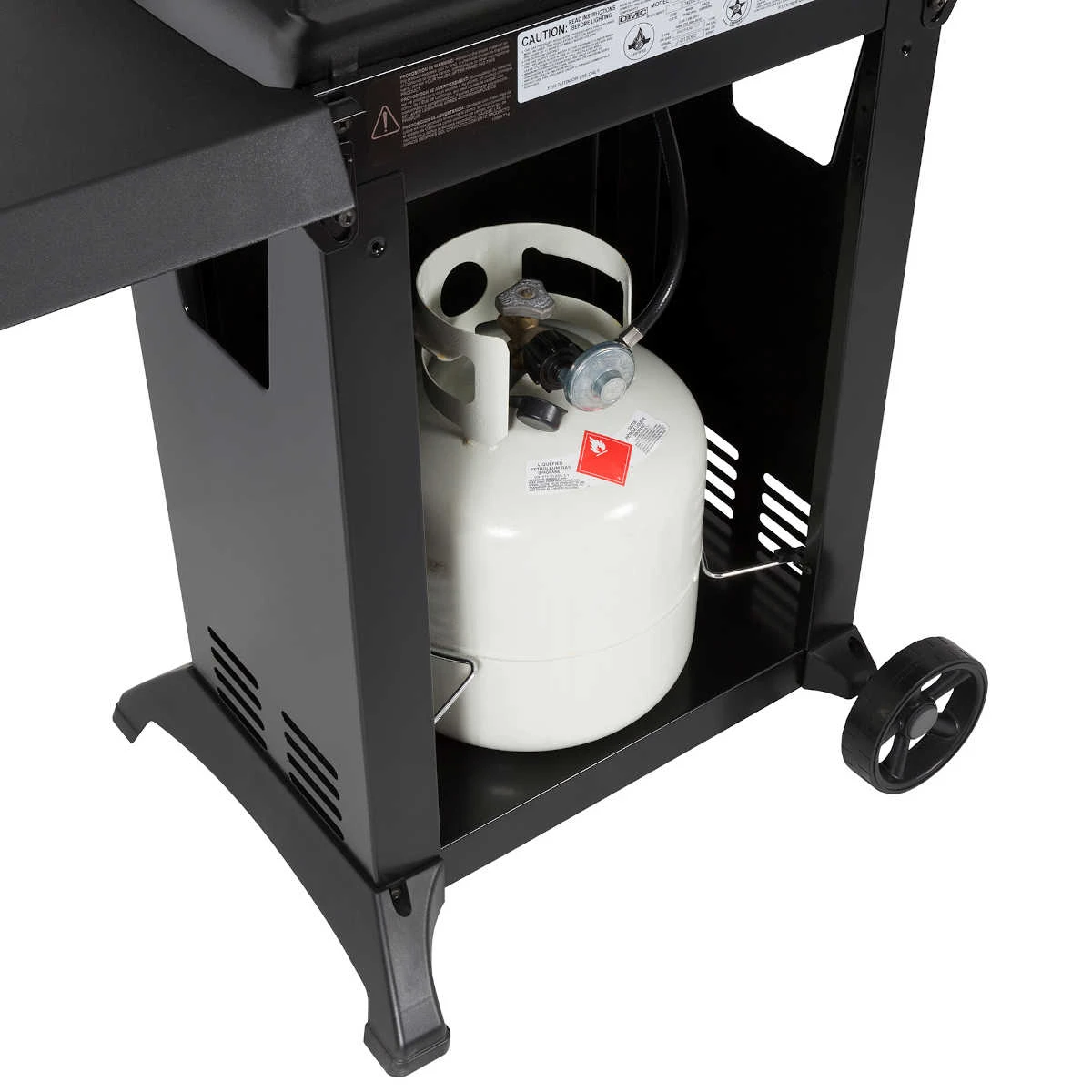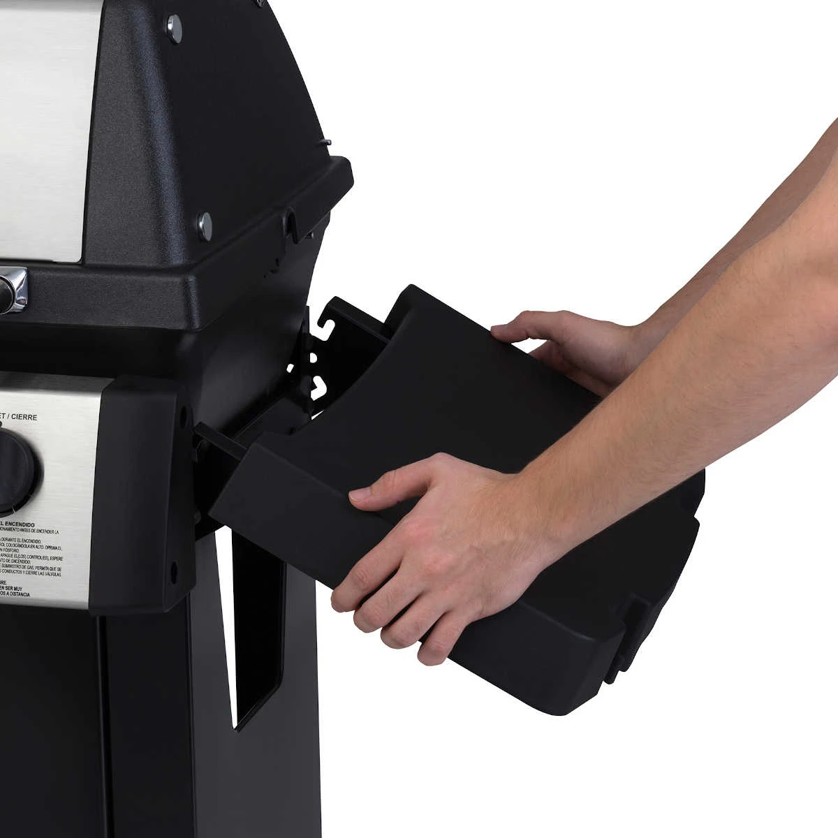 - Zubehör: Deluxe Accu-temp Deckelthermometer, Kunststoff Seitenablagen (klappbar), Edelstahl Flav-R-Wave Verdampfungssystem, Zubehörhaken, 2 Räder und 2 Standfüße verchromter Deckelgriff