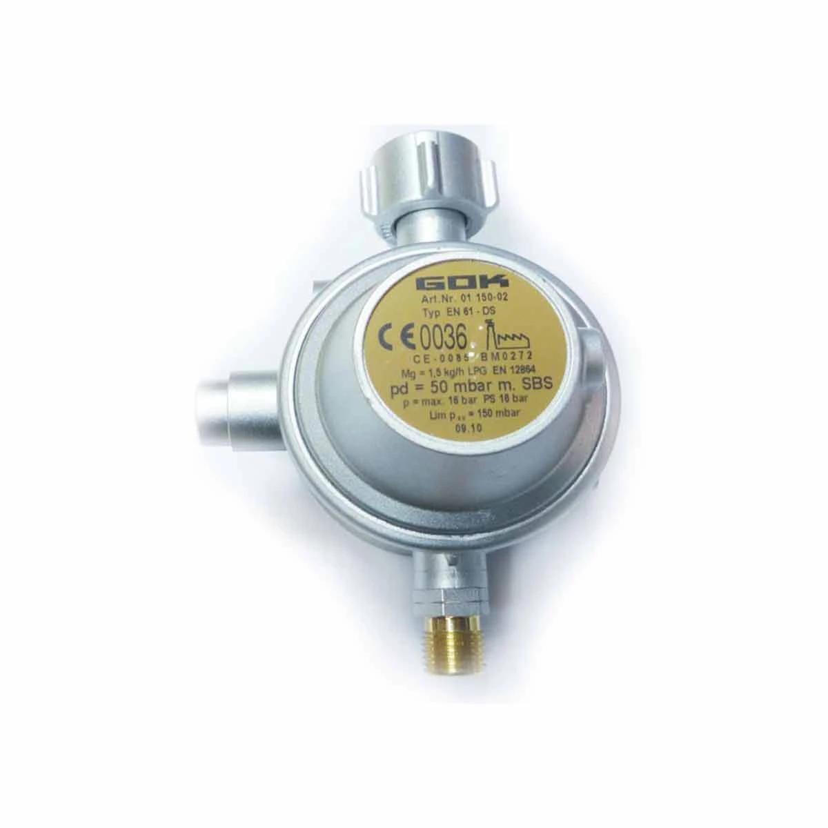 Gasregler 50 mbar mit intigrierter Schlauchbruchsicherung. Der Druckminderer ist mit einem Kombistutzen ausgestattet, damit können Sie eine 5, 11 oder 33 kg Gasflaschen an Ihren Gasgrill anschließen.